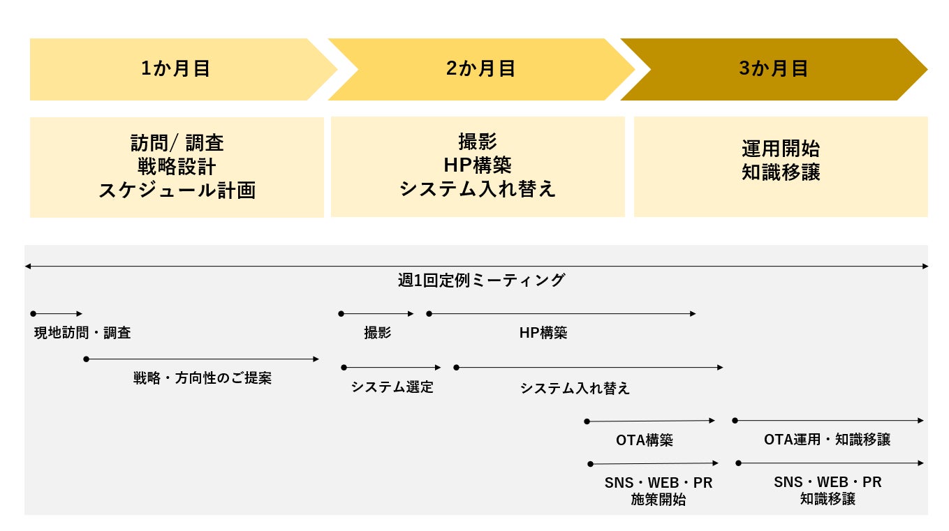 - 2か月目:撮影・HP構築・システム選定/入れ替え・OTA構築・SNS運営・WEB広告・PR施策開始