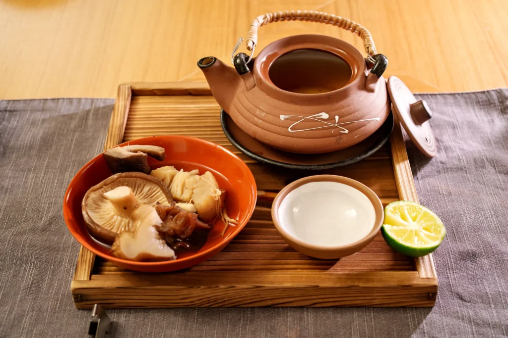 最初に供される温かい椀物。猪苗代湖の“ひしの実”を焙煎したひし茶と、舞茸・木耳・会津人参など、土地の恵みをふんだんに使った薬膳スープだ。香りは柔らかく、口に含むと優しい旨味がじんわり広がる。胃を温め、体を“食の時間”へ整えるような役割を果たす一品で、コースの幕開けにふさわしい。