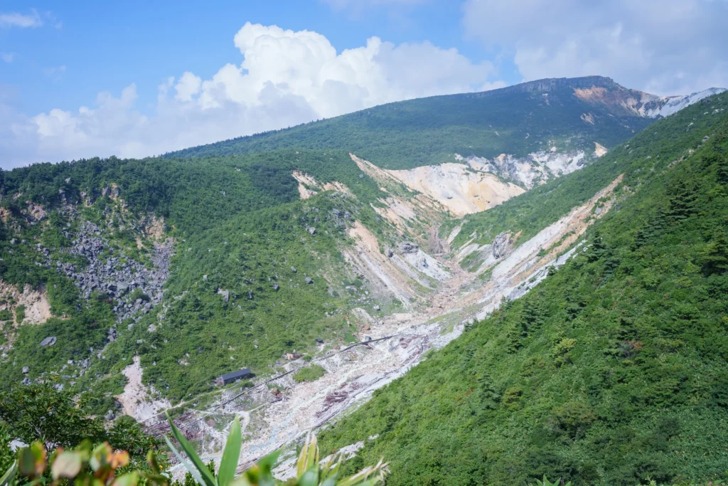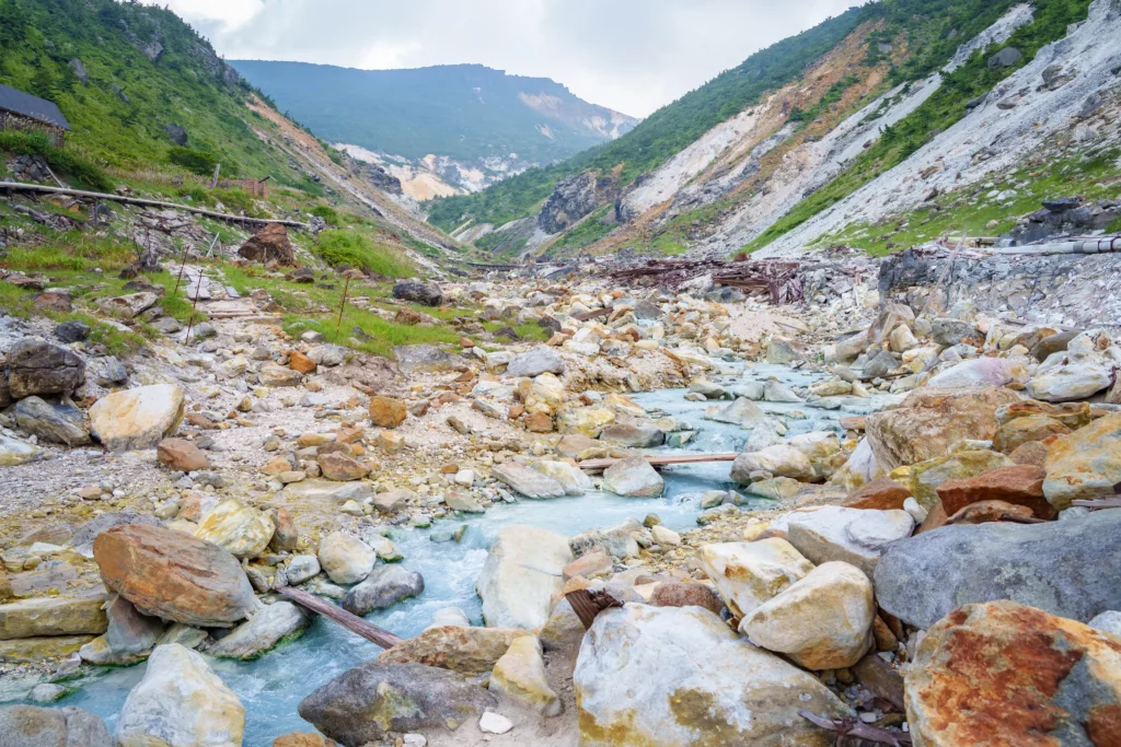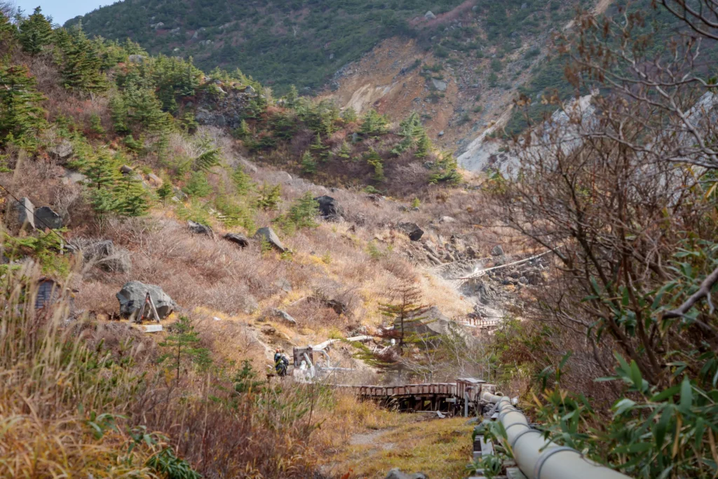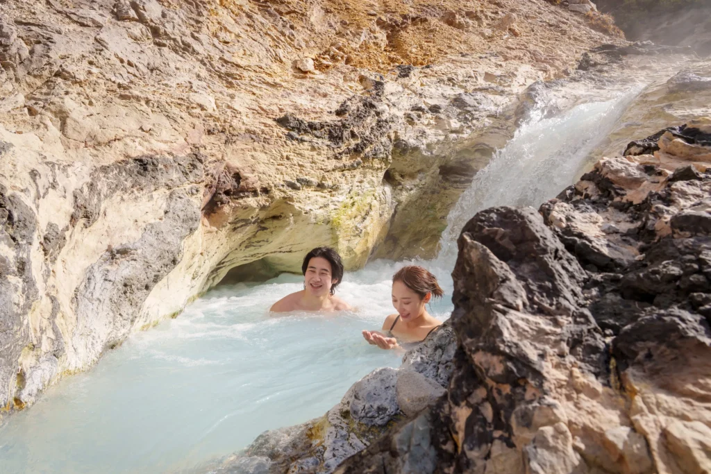 スタート地点から30分ほど歩くと、ほんのり硫黄の匂いが漂い始める。谷が開け、目的地に着くと、そこには想像の数倍スケールの大自然が広がる。谷底を温泉が川のように流れ、脇の湯口は60度近い熱を持つ。滔々と続く湯流は、まさに大地そのものが湧いているようだ。