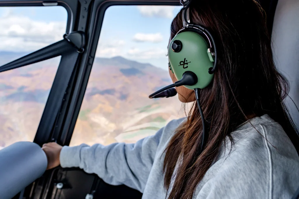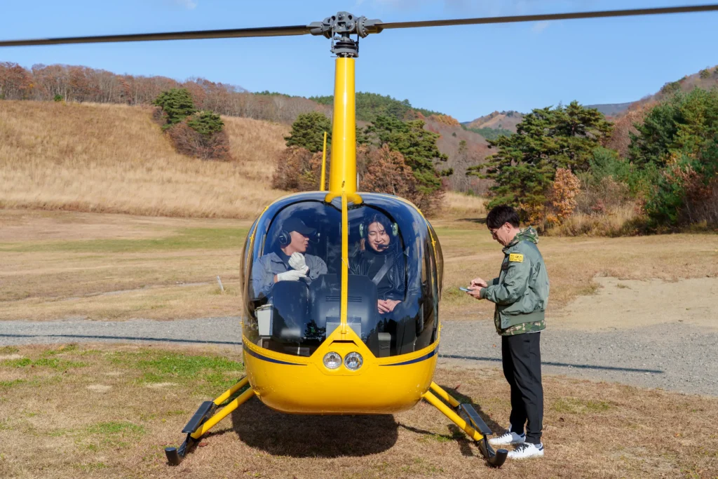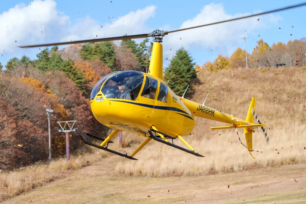 ロッジ前の草原で待っていると、遠くからヘリの音が近づいてくる。間近で見るヘリコプターは想像以上に迫力がある。プロペラが巻き起こす風、間近で感じる振動。普段見ることのない“機体の大きさ”に、思わず息を呑むほど。
