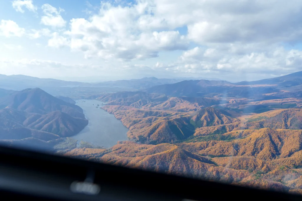 離陸直後、真っ先に目に飛び込んでくるのは、秋の高原の圧倒的なグラデーション。ロッジ周辺はオレンジ色の紅葉に包まれているが、少し進むだけで緑が残る森が現れ、さらに進むとまた違う表情の山並みに切り替わっていく。