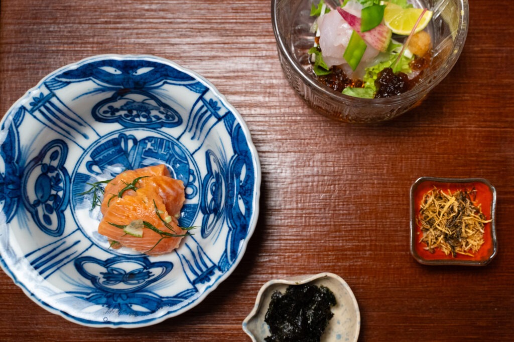 テーブルに並ぶのは、目にも涼やかな4つの小皿です。青い器に盛られた下郷産ニジマスのライム和えを、まずはそのままで。次に有明産海苔を出汁醤油で和えた“しめしのり”を追加すると、ため息が漏れるような新しい味わいが広がります。
