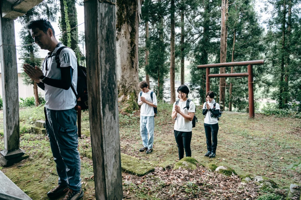 At the first small shrine, we pressed our hands together to pray for safety before entering the mountain. Along the path stood wooden posts once used for hazakake—the traditional way of hanging rice to dry. Traces of everyday life remain quietly etched into the landscape.
