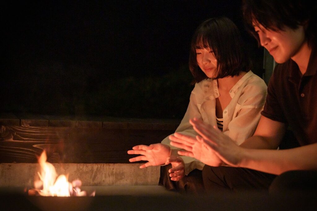火のぬくもりと森の静けさに包まれながら、自然と会話が弾み、心の距離がぐっと近づく。