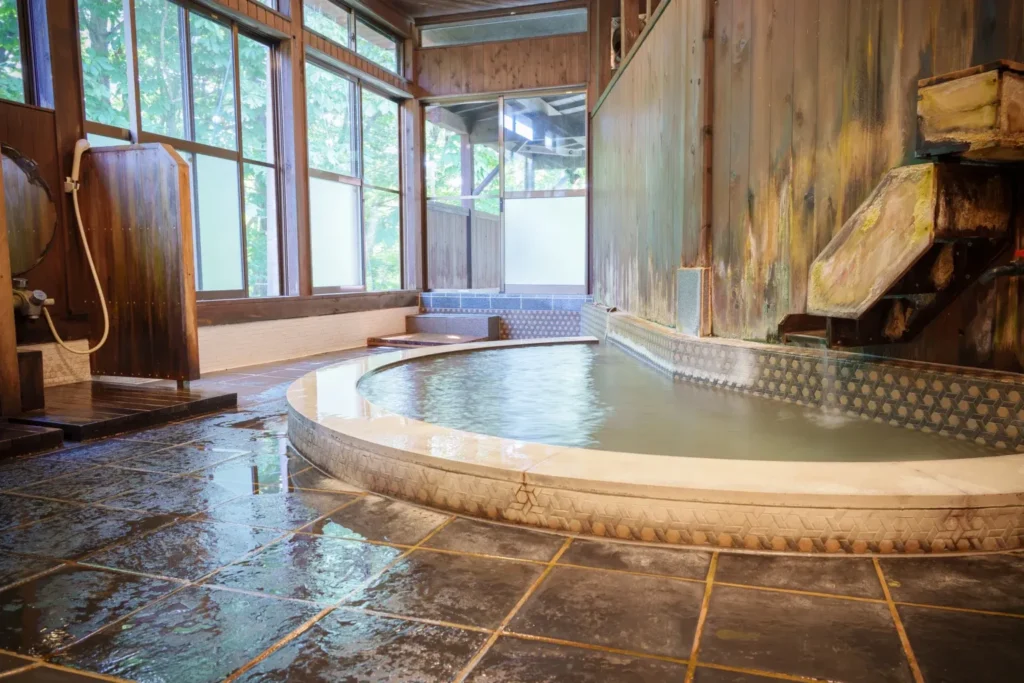 ここで引かれているのは、約400年の歴史を持つ「沼尻元湯」から湧き出る源泉かけ流しの湯だ。標高1250mという高地から湧く強酸性硫黄泉は、pH2.1とレモン並みの酸度を誇る“薬湯”で、古くから美容や健康に効果があるとされてきた。肌にまとわりつくような湯は、浸かるとキュッと引き締まる感覚があり、湯上がりには驚くほどなめらかな肌になる。