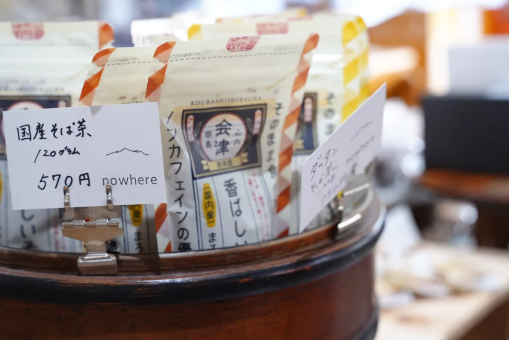 ここでは深煎りのオリジナルコーヒーを楽しみながら、窓の外に広がる草原を眺めて過ごす人も多い。店内には、ひし茶など猪苗代のお土産もあればエクストリーム温泉限定のステッカーやTシャツなどのオリジナルグッズも並んでいる。デザインもかっこよく、旅の思い出としてぴったりだ。