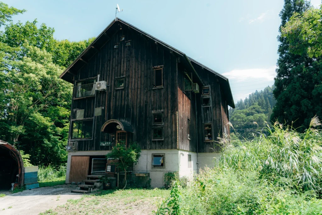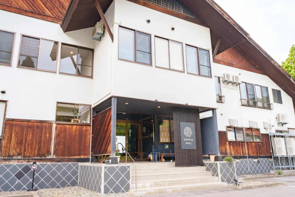 車で30分ほど山道を抜けていくと、森に溶け込むように建つ木造の宿が現れる。ーーこれが「醸す森」だ。