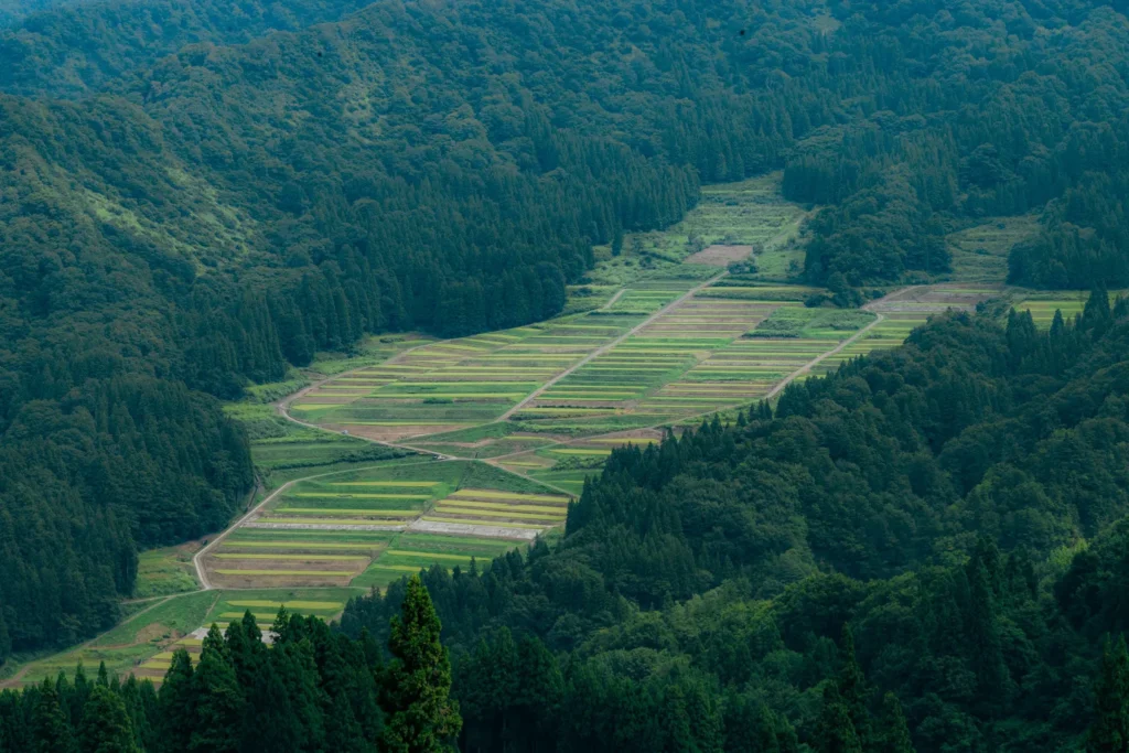 信濃川が削ってできた谷と棚田が重なり合い、立体的に広がる景観はまるで大地のアート。