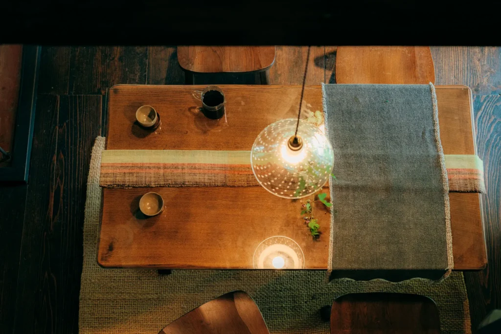 古材の床に置かれた鉄や木の造形、選び抜かれた椅子やカップ――