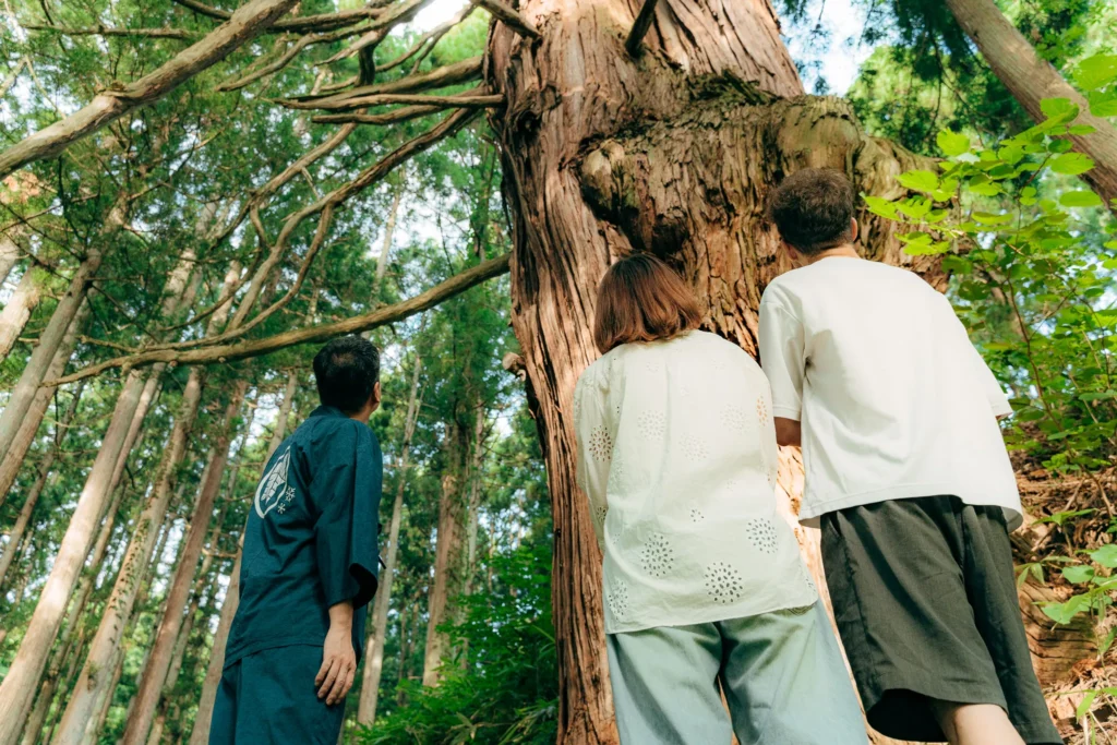隔天早上,從旅宿步行1分鐘就到松尾神社。老實說起早床有點痛苦,但一踏進杉林,涼爽的空氣與杉木的氣味立刻把我喚醒。沿著石階往上,有一對樹齡500年的「夫妻杉」。一抬頭,脖子會忍不住越伸越直,氣勢真的很驚人。穿過神社,稻田風景忽然展開,耳邊是風聲與鳥鳴。腳邊有茗荷、山椒等可以入菜的野草樹木,還有很多小青蛙。如果沒來到這裡,我不會有這種清晨的空氣筆直灌進身體的感覺。