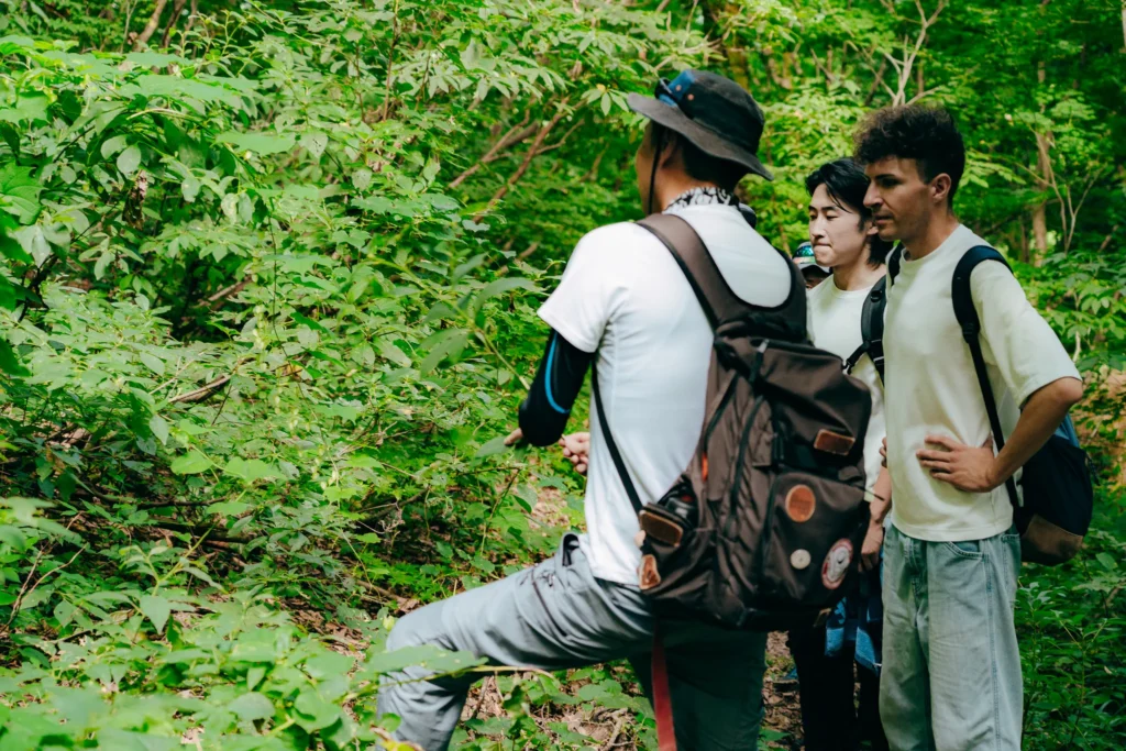 轉進未鋪面的舊路,腳底能感到泥土的彈性。穿行在樹影斑駁下,搓揉一下「傘花山胡椒」的枝條,指尖立刻浮出一股清新香氣。進到山毛櫸(ブナ)林,空氣一下子涼了起來。邊走邊聽井比先生說葉子與土壤如何「抱住」水分,步伐自然就慢了下來。