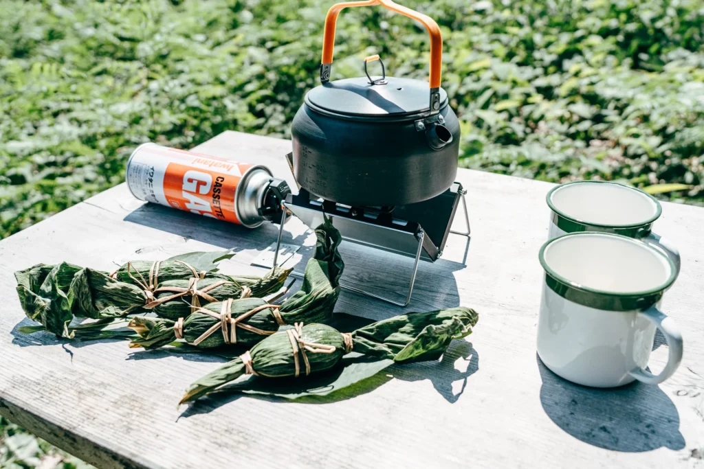 在這裡休息。井比先生從背包拿出小茶壺組與「篠竹糰子」。就地燒水、沖了傘花山胡椒茶。「來,傘花山胡椒的草本茶。」剛剛採的枝條就是為了這個。清爽的香氣讓汗也跟著退了。(我本來就喜歡芳療與草本,所以這種「真的東西」很讓人開心。這種體驗在台灣從來沒試過。)