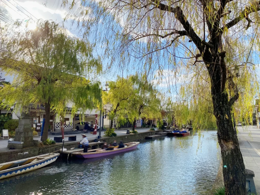 川下りは、柳川を流れる「筑後川」をゴンドラのような船に乗って進む体験です。船頭さんが櫂(かい)を使ってゆったりと進むので、まるで時が止まったかのように穏やかな時間が流れます。水面に映る木々や小さな橋、古い町家など、風景が美しく、まさに絵画のような瞬間が広がります。春には桜が咲き誇り、秋には紅葉が美しいので、どの季節に訪れても異なる魅力を感じられるのが魅力です。