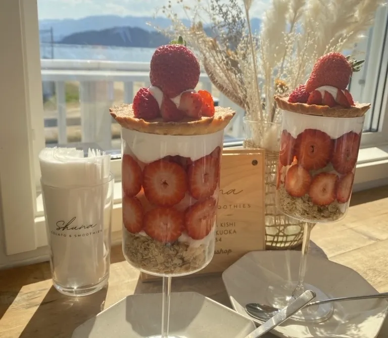 Shunaの魅力は、何と言ってもそのメニュー。地元の新鮮な食材を使用した料理やスイーツは、見た目にも美しく、インスタ映え間違いなしです。特に、苺のあまおうを使用したパフェやドリンクは、見た目はもちろん味も絶品で一度食べてみる価値があります。