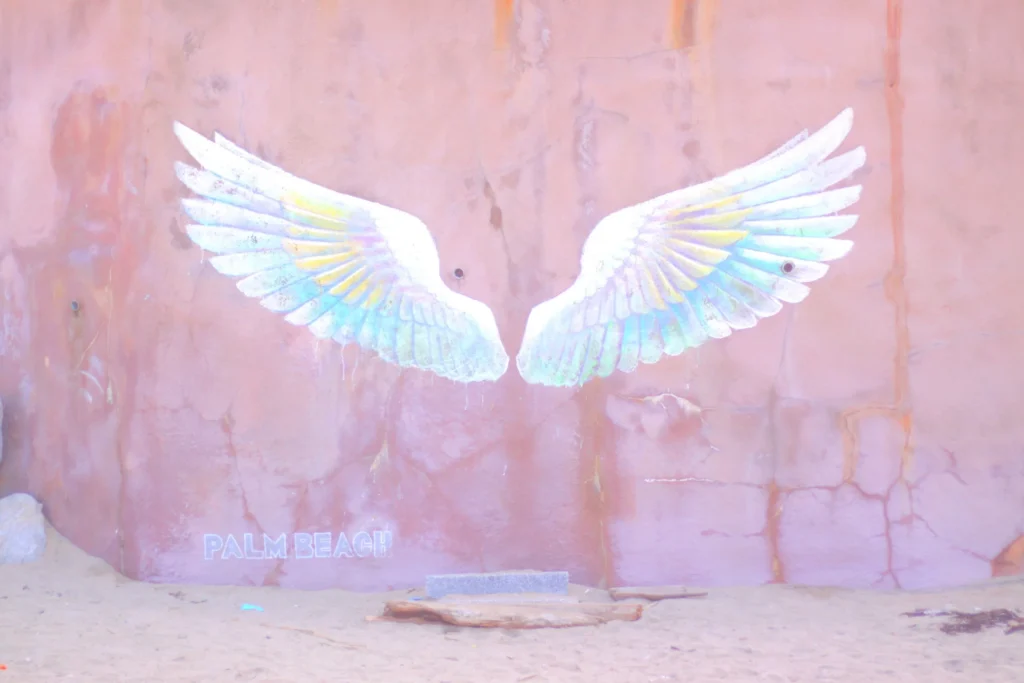 糸島の美しい海岸線を楽しむなら、次に訪れたいのが「天使の羽(パームビーチ)」です。ここは、パームビーチガーデンズから砂浜に降りたところにある壁に描かれた天使の羽で、インスタ映えする写真を撮るには最適な場所です。ビーチには、まるで天使の羽のような形をしたアートが描かれてており、訪れる人々を魅了しています。