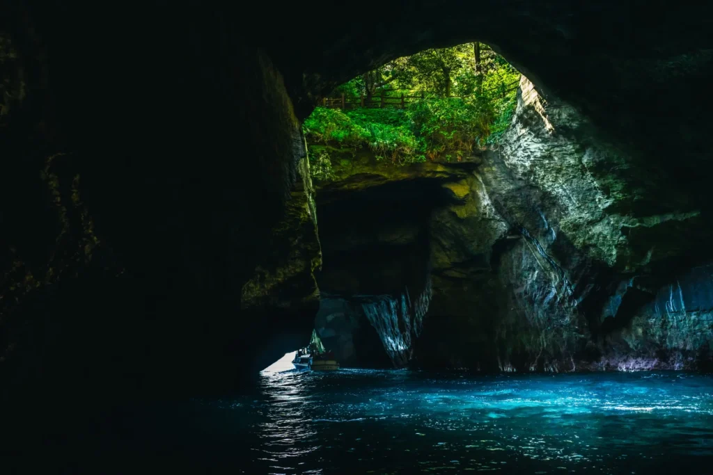 伊豆の女子旅で欠かせないスポットのひとつ、「天窓洞」は、堂ヶ島の名所として知られ、国の天然記念物にも指定された美しい自然の奇跡です。この神秘的な洞窟は、波によって何万年もの歳月をかけて削られ、洞窟の天井部分に大きな穴が開いているのが特徴。光が差し込むことで、その美しい青い海水がエメラルドグリーンに輝き、まるで幻想的な世界に迷い込んだかのような気分にさせてくれます。