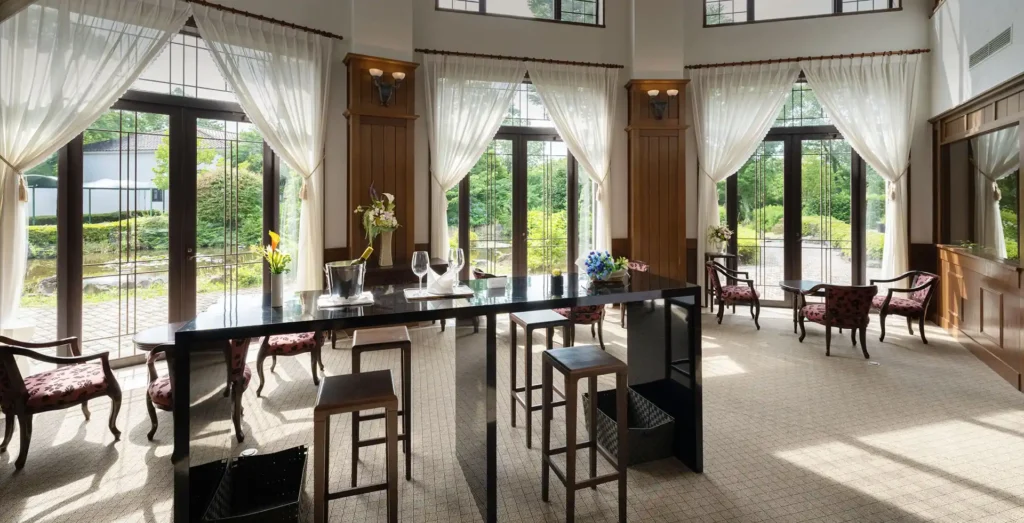 ホテル内は、開放感あふれる広々とした客室が特徴で、洋風の洗練された空間が広がります。吹き抜けのあるロビーや、野鳥が訪れる中庭で、自然の息吹を感じながらリラックスできます。自然の景色に調和した洋館の設えが美しく、心地よい風が吹き抜ける空間で、贅沢なひとときを過ごせるでしょう。