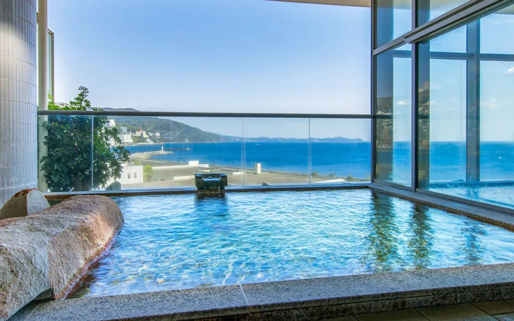 このホテルの最大の魅力は、なんと言ってもその「絶景の露天風呂」です。海に面した露天風呂からは、熱海の美しい海と空を一望することができ、湯船に浸かりながらリラックスできる最高の環境が整っています。朝日が昇る時間や夕焼けの時間帯は特に美しく、自然の美しさを存分に感じながら贅沢な時間を過ごすことができます。
