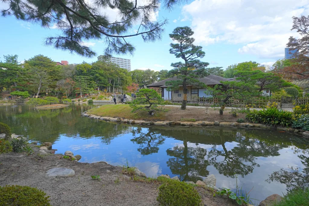 縮景園の中心には「鶴亀の島」と呼ばれる島があり、長寿や繁栄を象徴しています。また、庭園内には茶室「清風館」があり、ここでは抹茶を楽しむことができ、伝統的な日本文化を体験することができます。特に、茶室から眺める庭園の景色は格別で、心が落ち着くひとときを過ごせます。