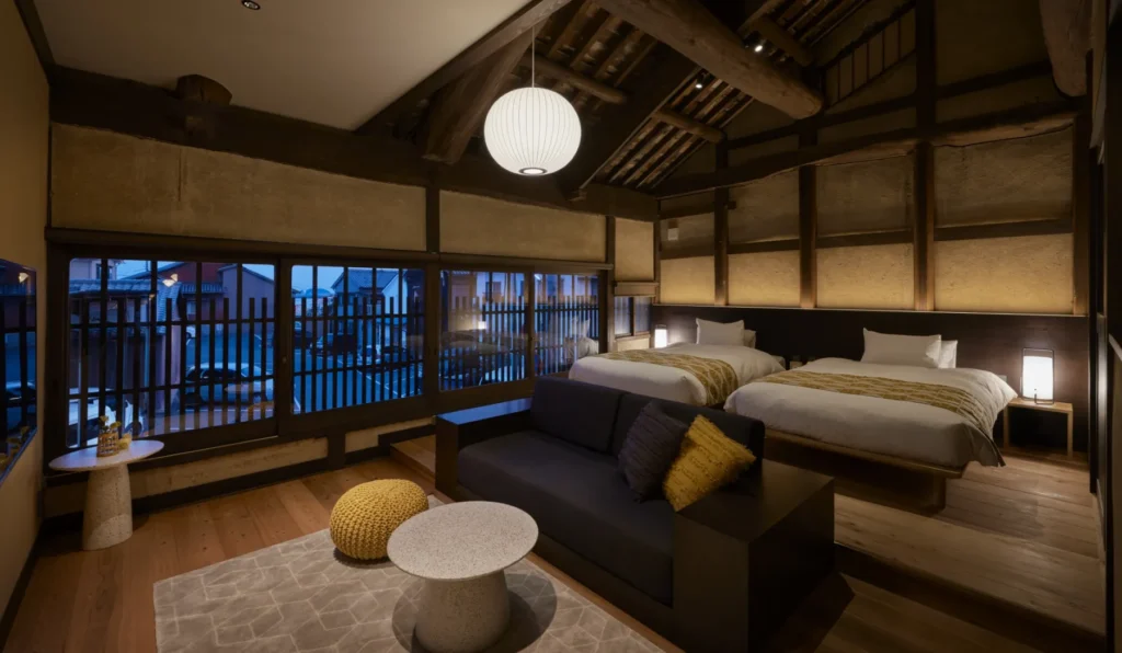 旅館の建物は伝統的な和風建築で、木の温もりと落ち着いた雰囲気が特徴です。客室は全て和室で、畳の香りとともに心地よい時間を過ごすことができます。窓からは鞆の浦の美しい景色が広がり、港町の風情を存分に楽しむことができます。