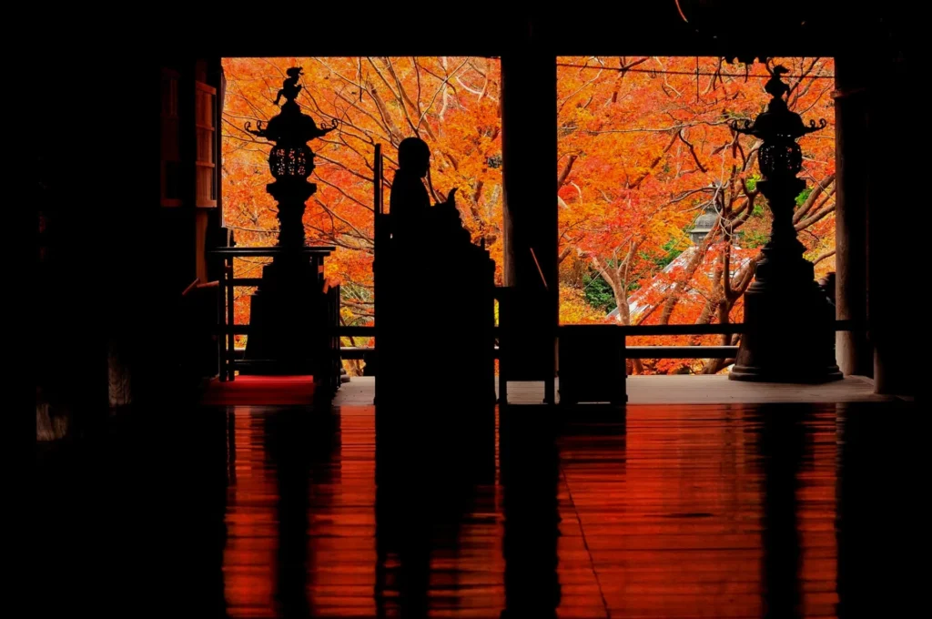 秋の紅葉シーズンには、山全体が鮮やかな赤や黄色に染まり、庭園の池に映る紅葉の姿が一層美しさを増します。静かな池の水面に映る紅葉は、まるで絵画のような幻想的な景色を作り出し、訪れる人々に深い感動を与えます。冬には、雪が降ることもあり、雪化粧をした庭園は、さらに静けさと神聖さを感じさせ、他の季節とはまた違った美しさがあります。