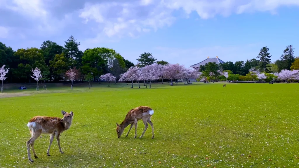 桜が咲く頃、特に奈良公園の東大寺周辺や池の周りでは、見事な桜並木が広がります。桜の花が風に揺れると、その花びらが鹿の背に舞い降りる様子が見る人々を魅了します。また、奈良公園は約1,200頭の鹿が自由に歩き回る場所としても有名で、その鹿たちが桜の花の下でくつろぐ姿は、訪れる人々に心安らぐ瞬間を提供してくれます。