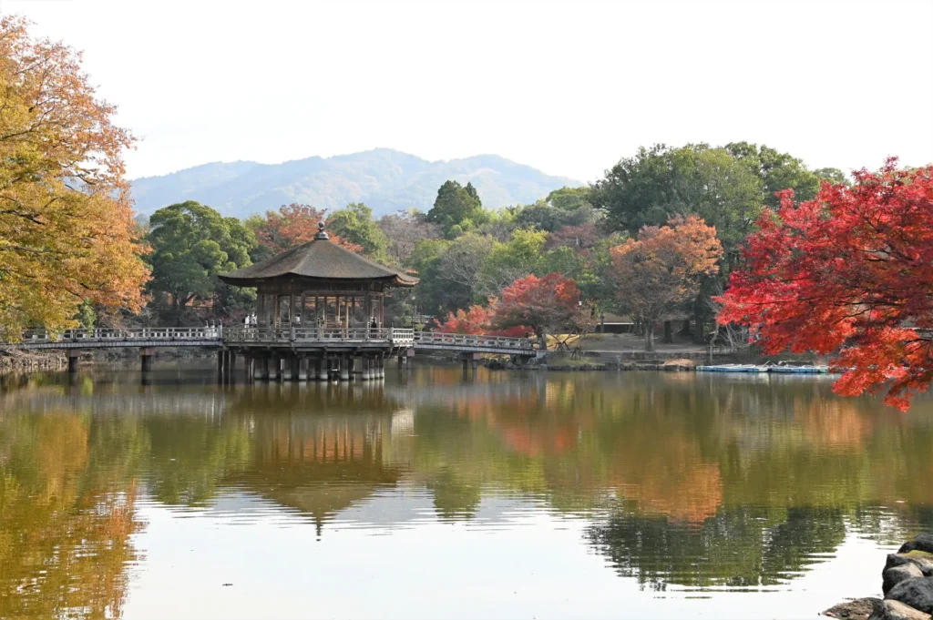秋になると、依水園は紅葉の名所としても知られ、庭園全体が鮮やかな赤や黄色に染まります。池に映る紅葉の美しさは圧巻で、まさにインスタ映えする絶景です。秋の空気とともに、歴史ある庭園が色づく様子は、訪れる人々に深い印象を与えます。