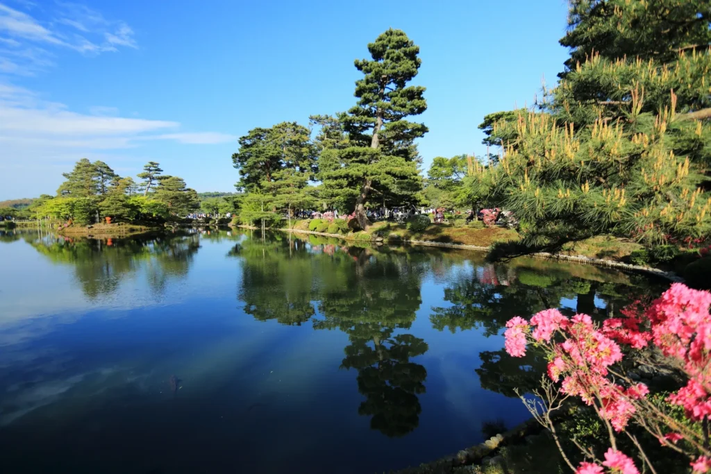 兼六園の特徴的な景観の一つは、名物の「霞ヶ池」です。この池は、周囲の自然と調和しながら、静かな水面に映る景色が訪れる人々の心を和ませます。また、園内には「根上がり松」と呼ばれる松の木があり、その独特な形状は多くの写真愛好家にとっての撮影スポットとなっています。