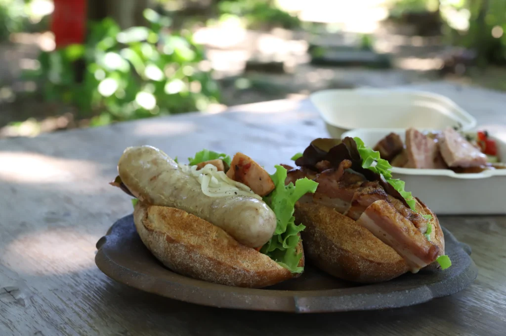 リバーワイルドは、福岡県うきは市吉井町に位置するハムファクトリー兼カフェです。ここでは、地元ブランド豚「耳納あかぶた」「耳納いっーとん」「リバーワイルドポーク」を使用した手作りのハムやソーセージを製造・販売しています。リバーワイルドでは、自社で育てた豚を使って、手作りでハムやソーセージを製造しています。そのため、品質と味は抜群。店内にはカフェが併設されており、出来立てのホットドッグやその他の軽食を楽しむことができます。特にホットドッグは、ジューシーで大きなソーセージが特徴で、ランチにもピッタリです。筑後川沿いの自然豊かなロケーションも魅力的で、川のせせらぎの中でリラックスしたひとときを過ごすことができます。