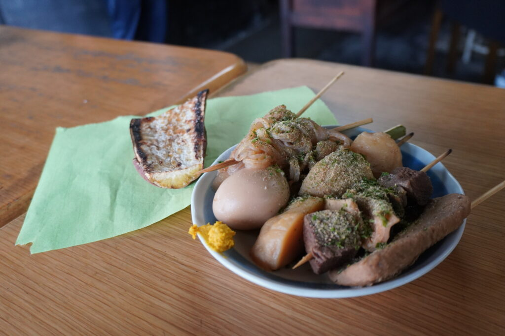If you’re in Shizuoka, be sure to stop by Ooyakiimo, a beloved local establishment. This historic shop serves Shizuoka’s famous Shizuoka Oden and roasted sweet potatoes, offering a warm and welcoming experience. The Shizuoka Oden features a unique black broth made from a base of bonito flakes and kombu seaweed, which gives it a distinct and rich flavor.