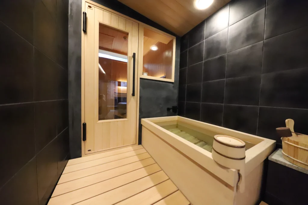 Each room is equipped with a private sauna, allowing you to lose track of time and enjoy sweating to your heart’s content. The aroma of tea during the sauna’s ‘loyly’ treatment calms the mind. The relaxation area offers a view of the sky, where you can feel the breeze while calming both your body and mind. The bath is made of hinoki (cypress wood), and it envelops you in a deep, forest-like scent, providing a blissful experience akin to a forest bath.