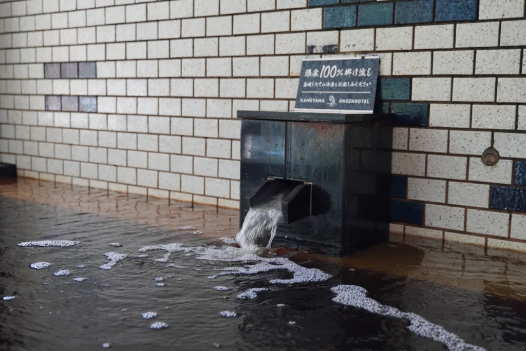 源泉100%かけ流し、チョコレート色の天然自噴温泉が、亀山温泉ホテルの自慢です。地下2000メートルから毎分600リットル以上の温泉が自噴しています。地下にマグマがないため湧出する温度は26.4℃と低いのですが、循環加温をさせながら新鮮なお湯と混ぜており、気持ちよく浸かることができます。