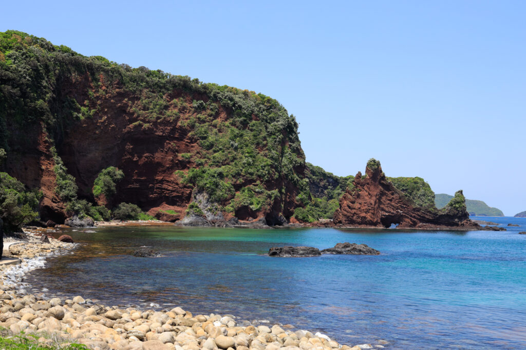 島根県隠岐郡に位置する明屋海岸は、美しい海と自然に囲まれた絶景スポットです。この海岸は、透明度の高い海水と赤く険しい岩が特徴で、訪れる人々に癒しのひとときを提供します。特に、夕日が沈む時間帯には、海と空がオレンジ色に染まり、まるで絵画のような美しい景色が広がります。