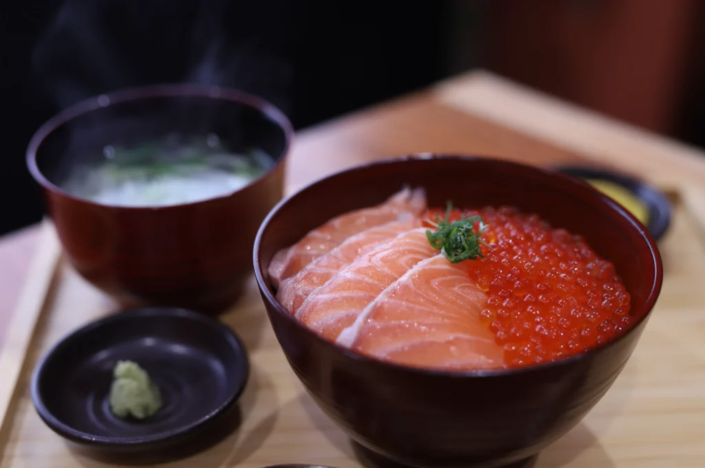 Kaisen Ikuraya Sachi is known for its seafood bowls that showcase the fresh flavors of Akashi, with a special focus on ikura (salmon roe). The standout feature of the restaurant is its high-quality, rich-tasting ikura, sourced fresh from Hokkaido. The roe’s satisfying texture and deep umami create a truly enjoyable dining experience.
