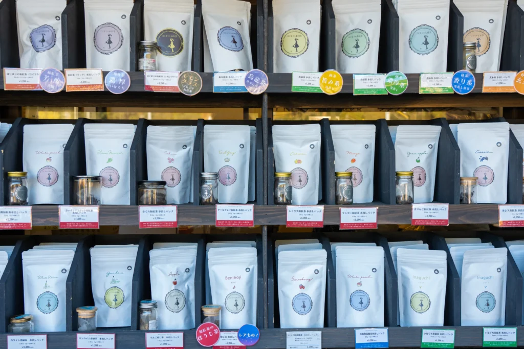 店頭では、茶葉の販売も行っています。浅蒸し茶をはじめ、深蒸し茶やほうじ茶など、数多くの茶葉を取り揃えています。足久保の自然とお茶文化を存分に味わえるこの場所は、都会の喧騒から離れた癒しのひとときを提供してくれること間違いありません。