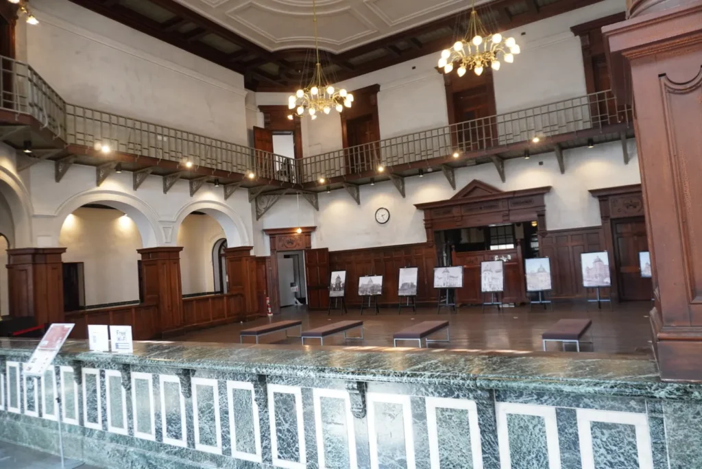 こちらの設計は、東京駅の設計も手掛けた辰野金吾・葛西萬司建築事務所が行っており、天井が高く開放的な造りは、当時の洋風建築の特徴を表しています。
