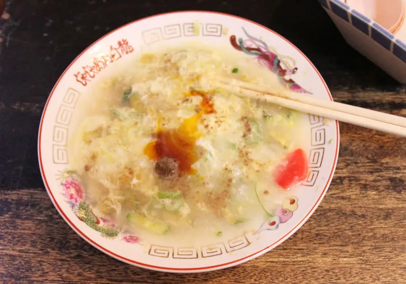 麺を少し残しておくのが大切なポイント。真ん中に卵を割り入れてかきまぜたら「ちいたんたん」を定員さんにお願いしてください。じゃじゃ麺のゆで汁、ねぎ、味噌をかけてお皿が戻ってきますので、よくかきまぜて飲んでください。じゃじゃ麺とはまた違う味わいがやみつきになります。