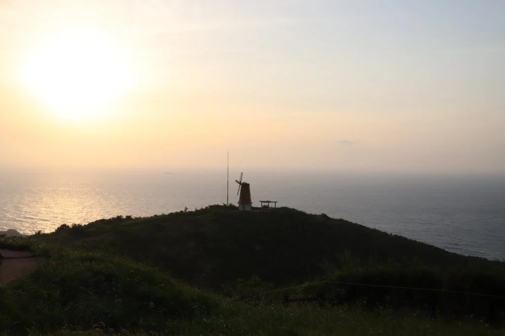 大島風車展望所は、宗像市大島の北部に位置し、小高い丘の上にある海を望む展望所です。赤い風車が目印で、展望所からは、玄界灘の美しい海景色を一望できます。晴れた日には、遠くに沖ノ島を望むこともできます。風車展望所の近くには、後述する戦時中に使われた砲台跡もあり、歴史を感じることができます。
