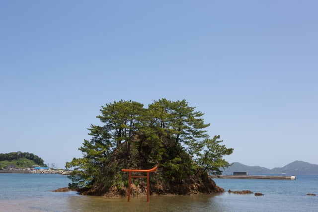During low tide, Yume no Sayo Island is connected to the mainland, and visitors can walk across the “sea path” that appears only during low tide. It is said that crossing this path together will lead to the fulfillment of love, making it a popular power spot for romance. The surrounding scenery is also very photogenic, with the vermilion torii, green pines, and blue sea creating a picturesque landscape that attracts photography enthusiasts. Especially during the early morning, the scene is enchanting. The island is also famous for being the subject of a poem written by the renga poet Iio Sogi in the Muromachi period, adding to its historical value, and its original form has been preserved to this day.