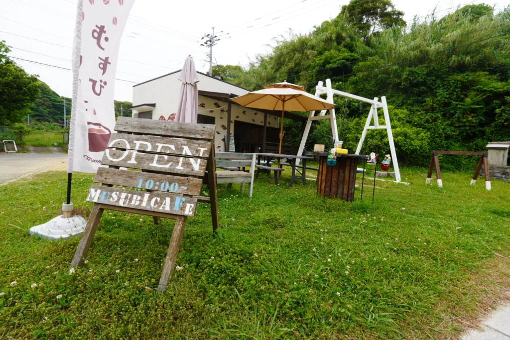 MUSUBI CAFEは、宗像市大島のかんす海水浴場前に位置し、海を一望できる絶景ロケーションが魅力のカフェです。島ならではのゆったりとした時間を過ごすことができ、観光客や地元の人々に愛されています。